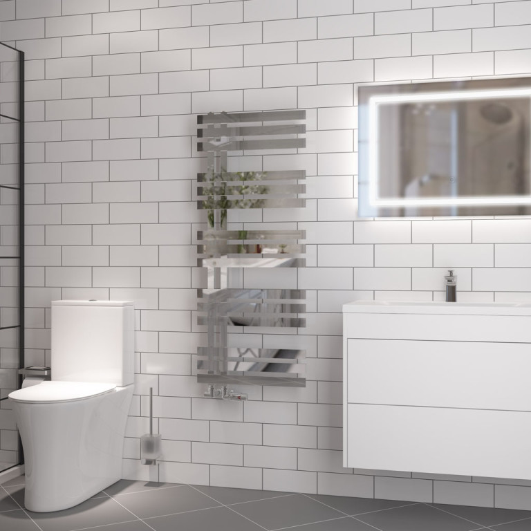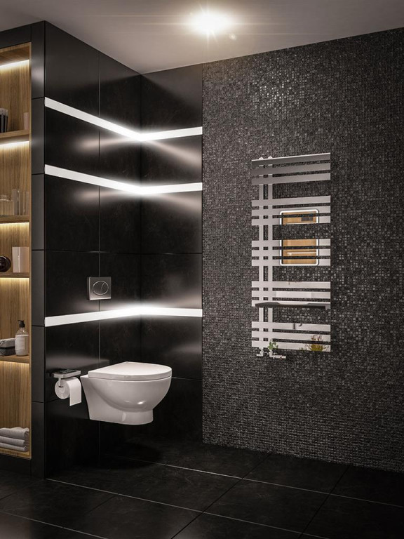 A modern, versatile designer towel rail. Available in 6 colours with reversible installation possibility.
