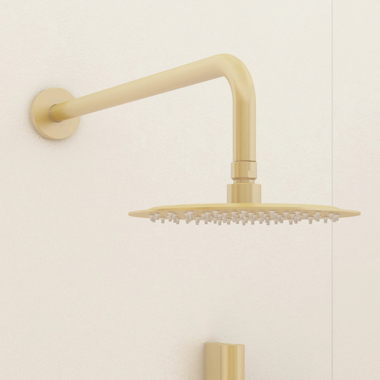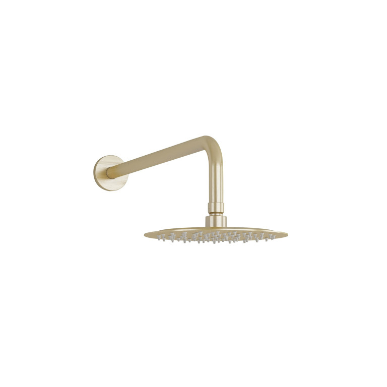 200mm stainless steel round slimline showerhead and design brass shower arm in Brushed Brass