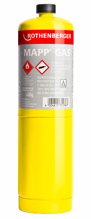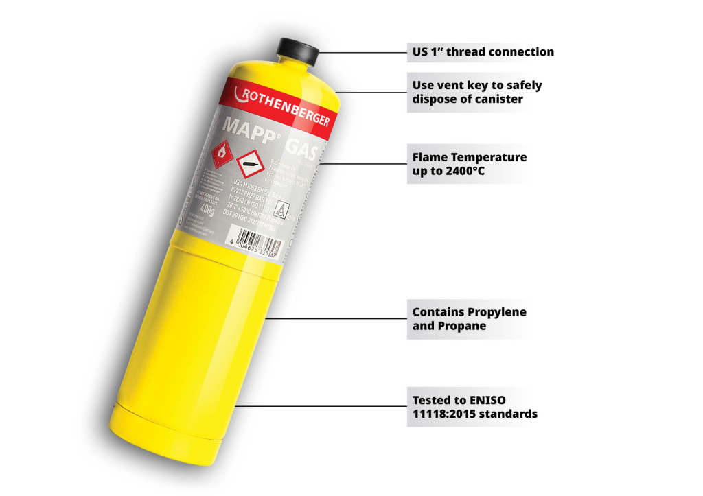 Designed to shorten work times, the Rothenberger MAPP Disposable Gas Cylinder delivers high-performance burning characteristics and an increased flame temperature (up to 2400°C). It is ideal for soldering and brazing tasks such as silver soldering of refrigeration pipework. Finally, to improve safety, the Rothenberger MAPP Disposable Gas Cylinder can be fitted with an optional cylinder stand (sold separately).
