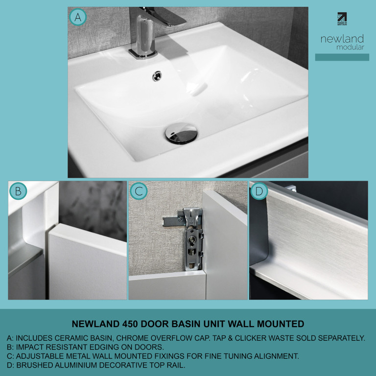 Newland 500mm Double Door Suspended Basin Unit Including Ceramic Basin - Pearl Grey