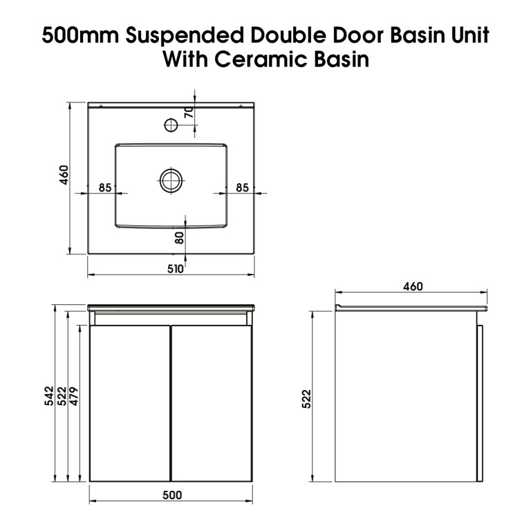 Newland 500mm Double Door Suspended Basin Unit Including Ceramic Basin - White Gloss
