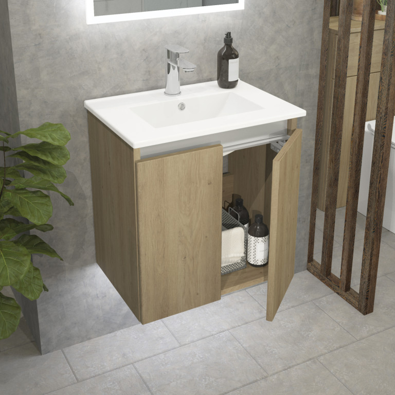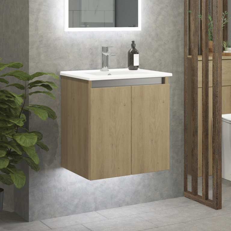 Introducing our remarkable double-door basin unit in a contemporary Natural Oak finish, designed to add a touch of sophistication to any modern bathroom.