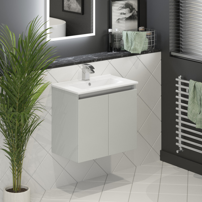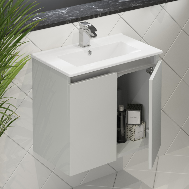 Newland 600mm Slimline Double Door Suspended Basin Unit Including Ceramic Basin -...