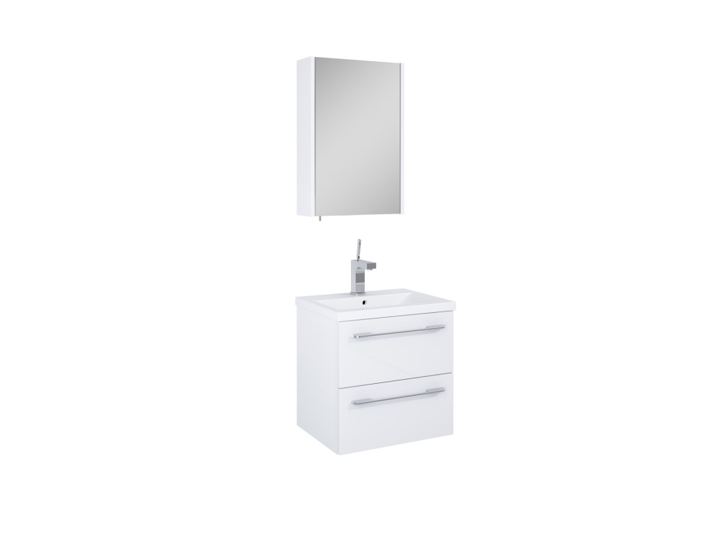 A contemporary range of bathroom furniture with an elegant chrome bar handle and lacquered or wooden finish