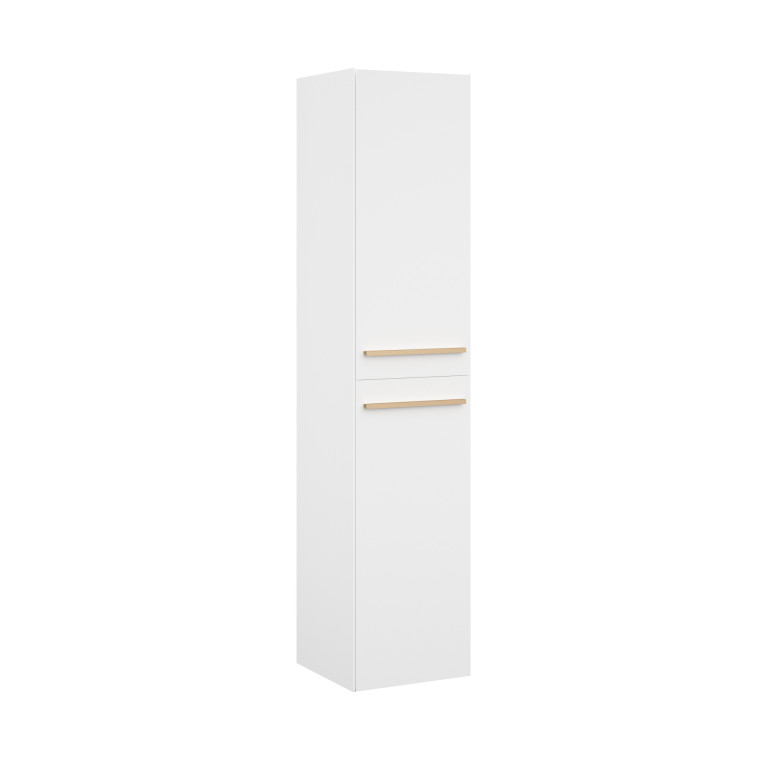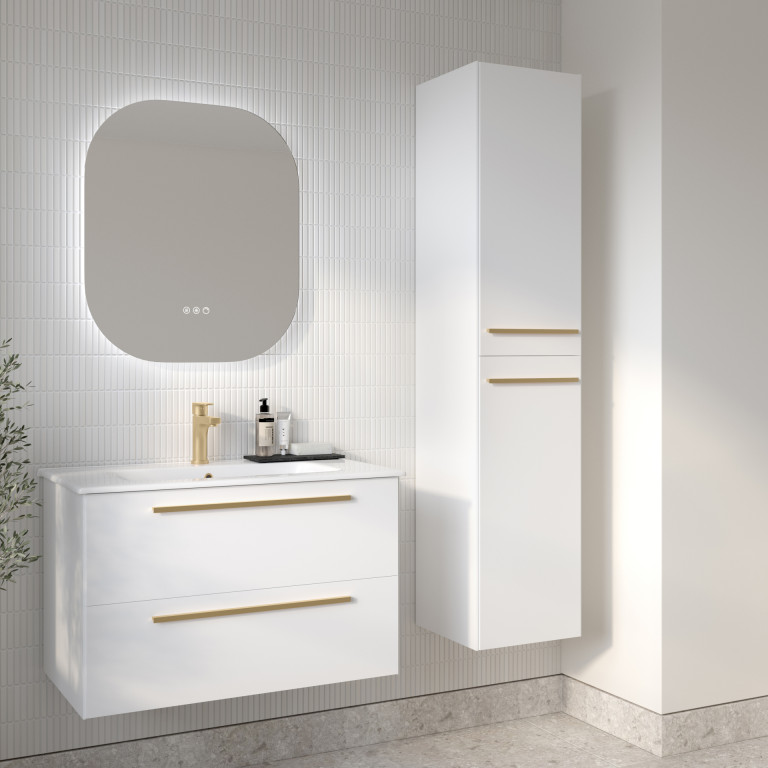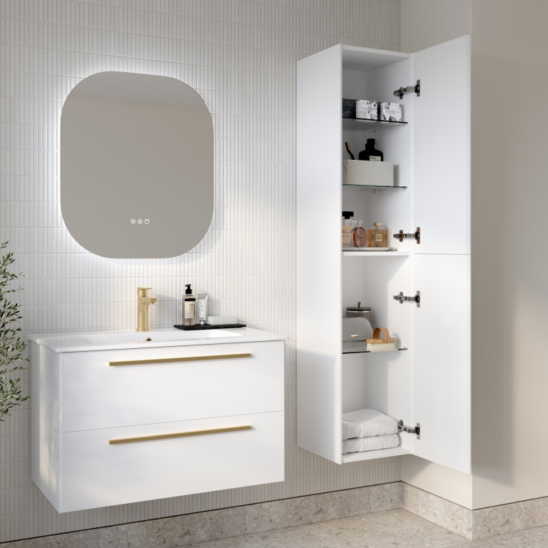 The Berwick wall unit is a versatile and stylish companion to the Berwick vanity unit. Its design is characterised by sleek angled edges, a modern slim bar handle and two doors revealing one fixed central shelf and 3 glass shelves.