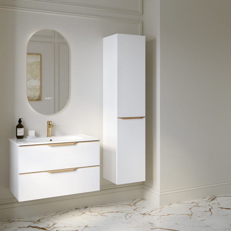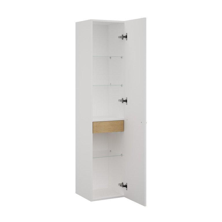 The Ottawa wall unit is a chic and modern companion to the Ottawa vanity unit. Its design is characterised by bold square edges, a full-width oak handle and one door revealing four internal shelves and an oak drawer.