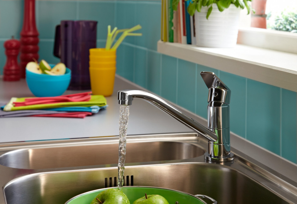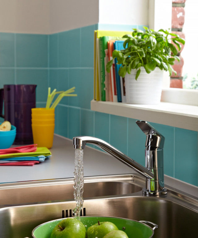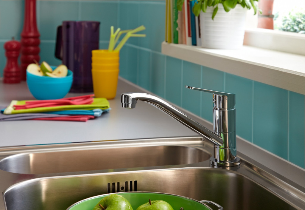 A simply styled, low profile kitchen tap with easy to use, large handle.