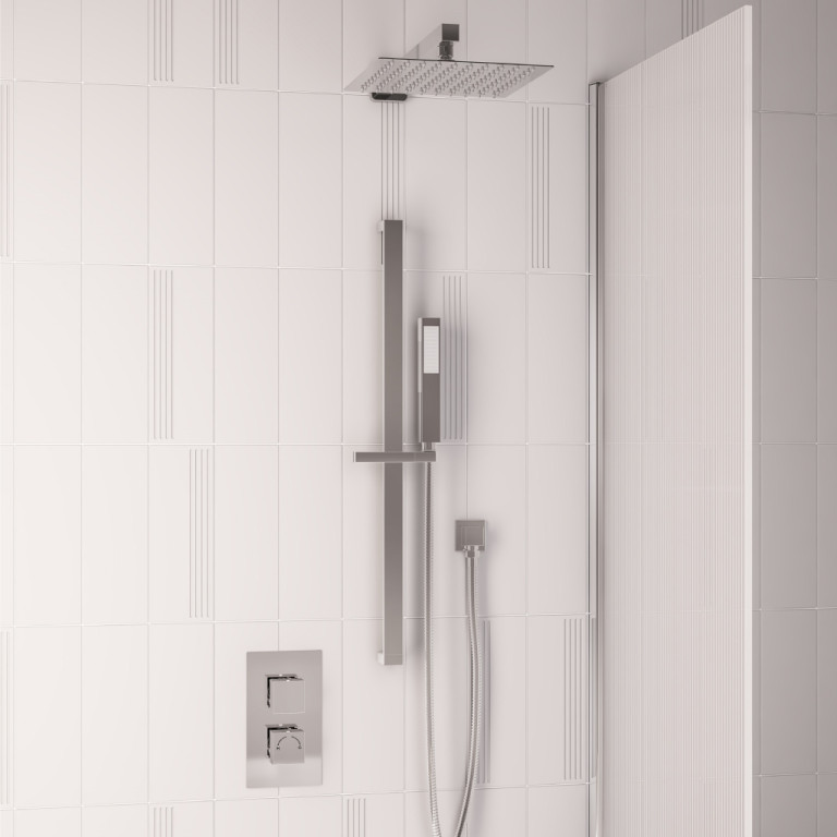 Twin Valve, Square Shower Head Square Riser Kit, Outlet Elbow, Hose, Handset