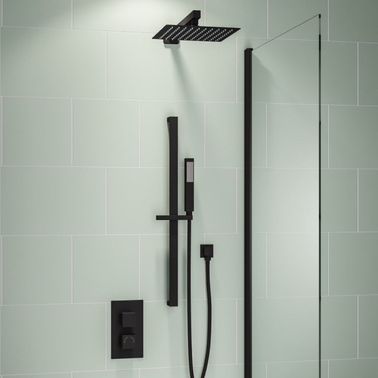Twin Valve, Square Shower Head Square Riser Kit, Outlet Elbow, Hose, Handset