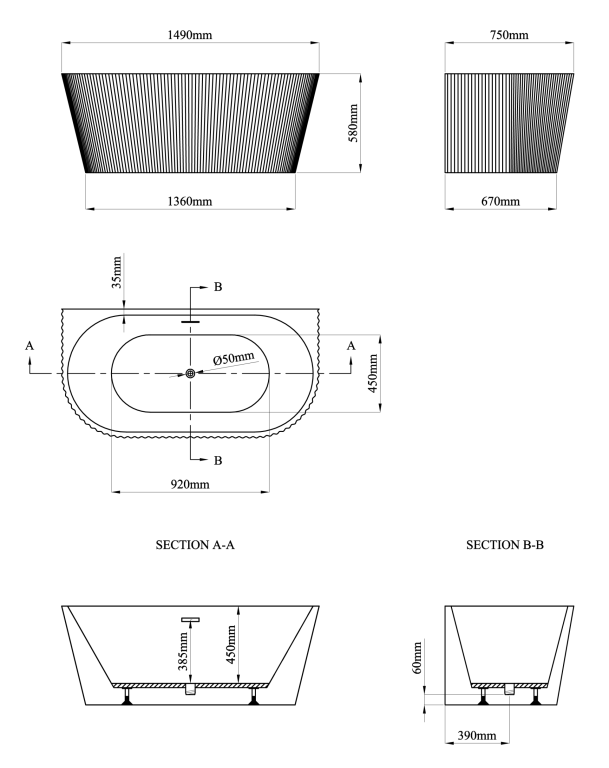 - 1485mm (L) x 745mm (W) x 580mm (H)
