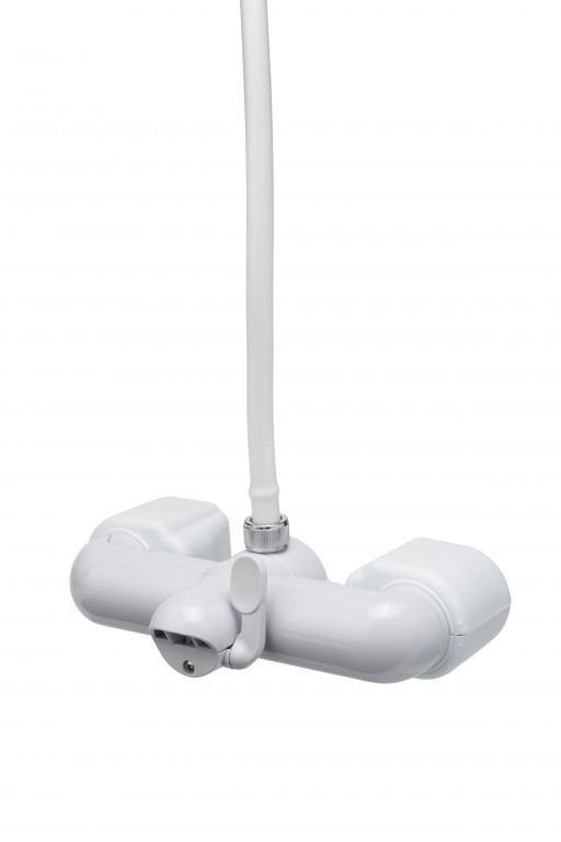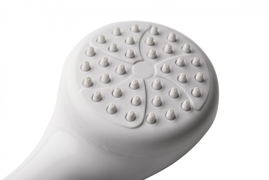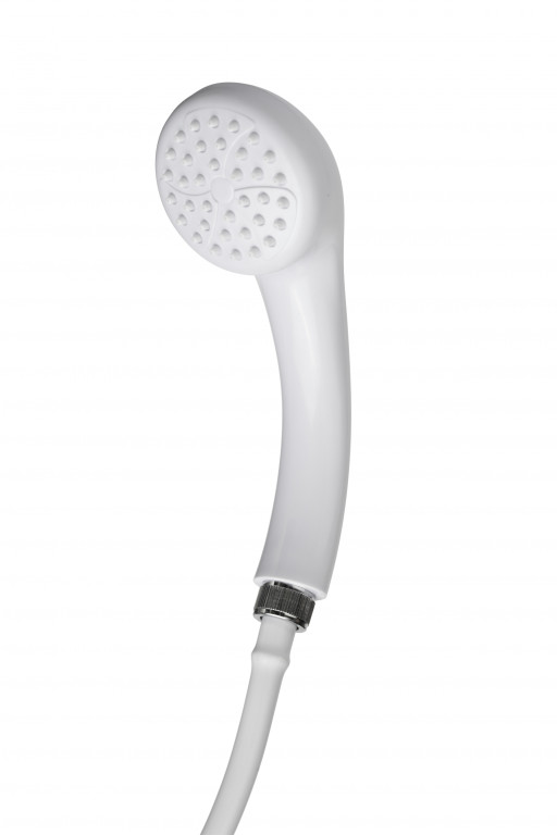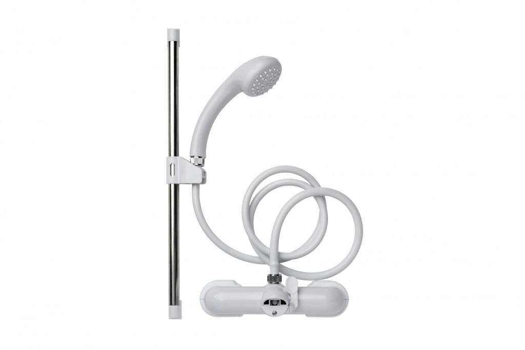 The fresh white set also includes a polished riser rail, single function handset and flexitube hose.- Best suited for round taps