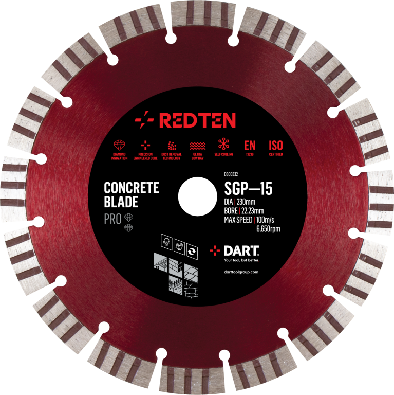 Pro performance concrete and general purpose blade with impressive cutting speeds and life with 15mm segment height. Cuts all concrete products: bricks, paving, stone and roof tiles. For light use on abrasive breeze and concrete blocks.