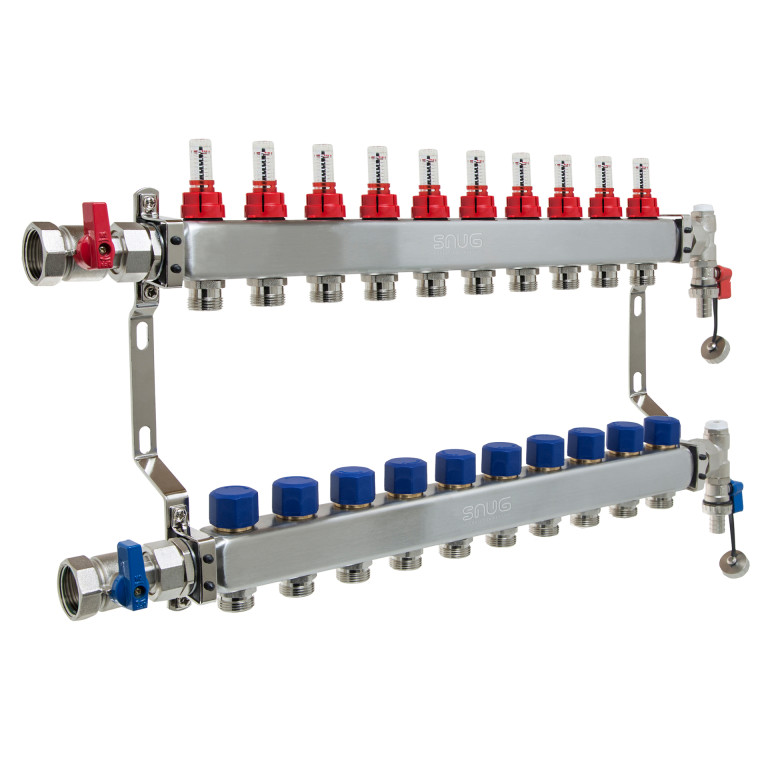 10 port stainless steel manifold comes with flow meter, isolation valves, drain off and manual air vents 676W x 320H x 90mmD