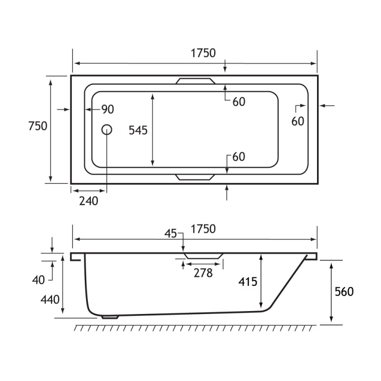 - Length: 1750mm, Width: 750mm, Internal depth: 440mm, Height: 560mm